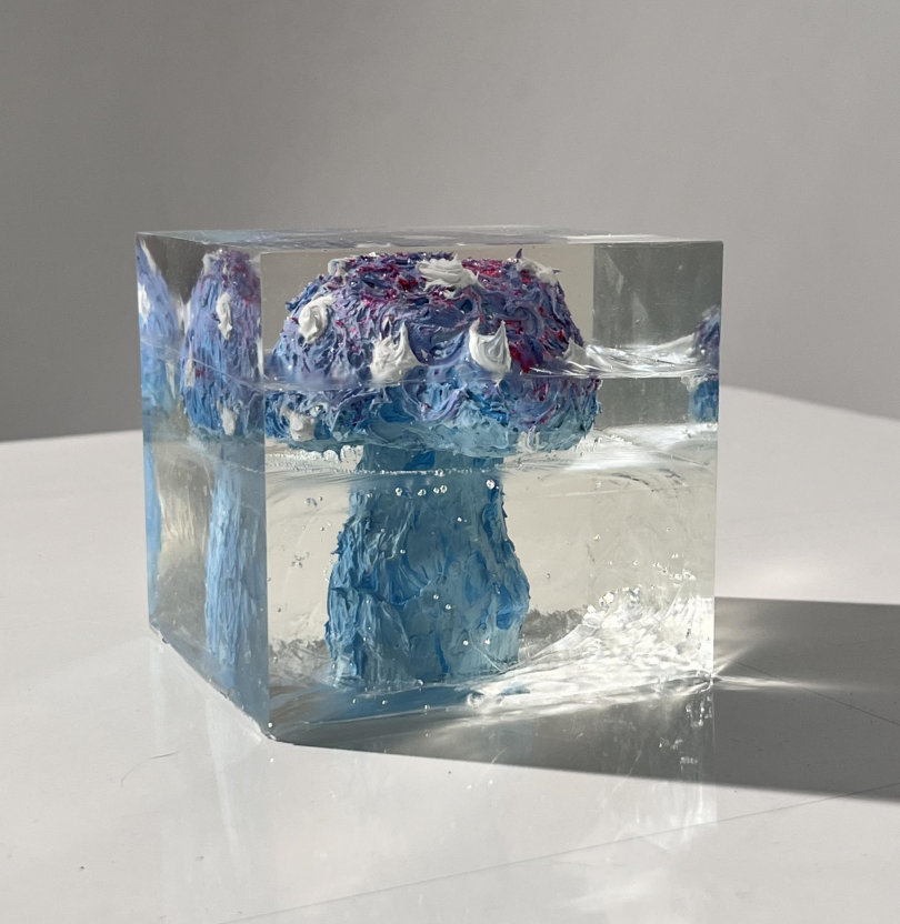A obra Criogênico evoca a sensação de suspensão no tempo. Como se estivesse preservado em criogenia, o cogumelo encapsulado convida à reflexão sobre a fragilidade e a permanência, ao mesmo tempo em que explora a dualidade entre a preservação e o efêmero.