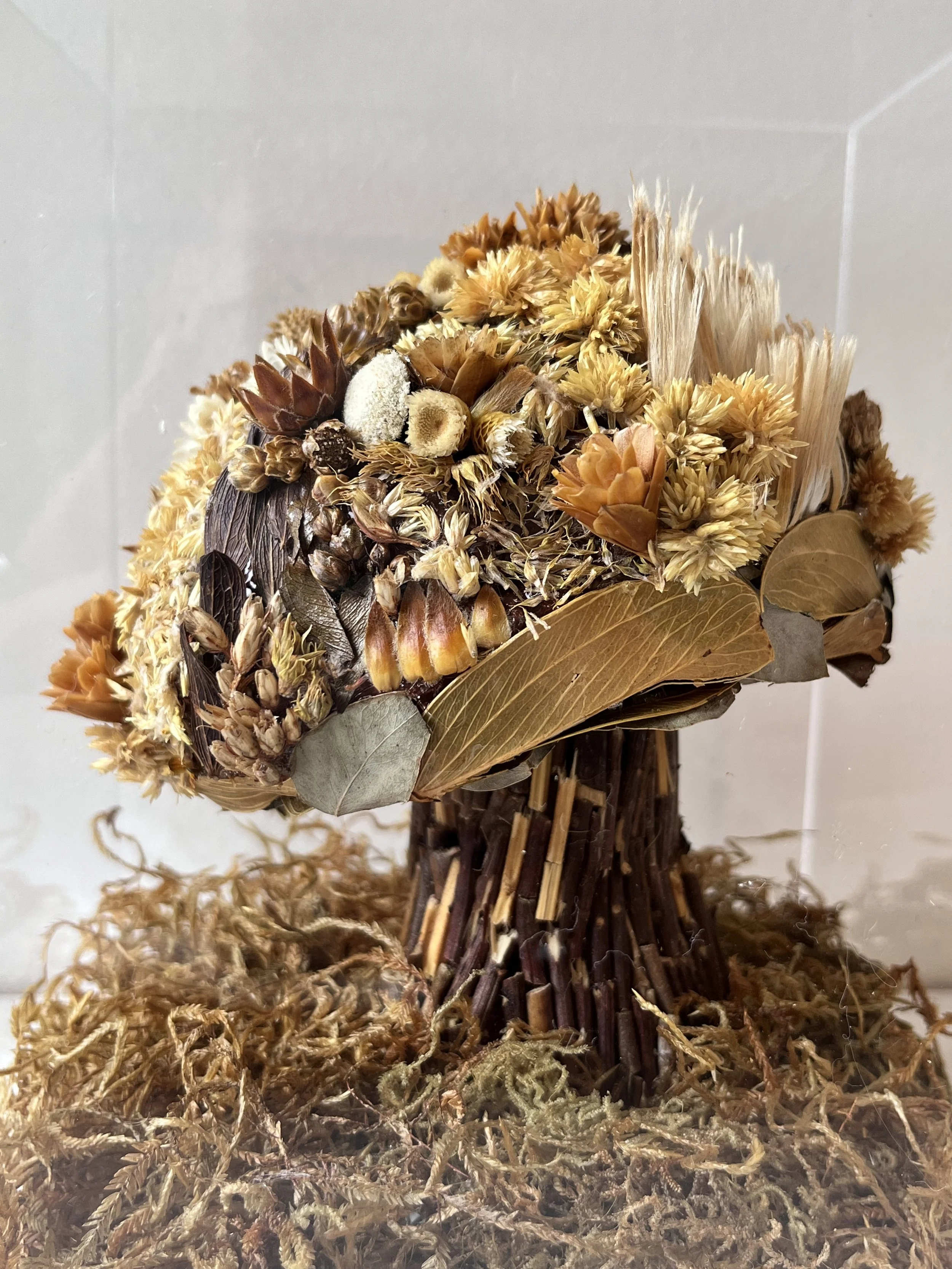 São obras que celebram a interseção entre o natural e o imaginário, dando vida a cogumelos reinterpretados. Criado com flores secas e elementos naturais, eles transcendem o biológico, reinventando a simbologia dos cogumelos como organismos efêmeros.
